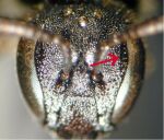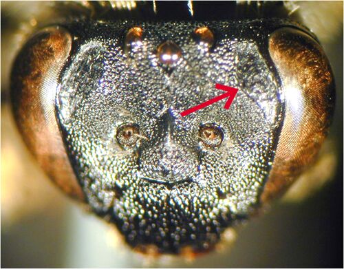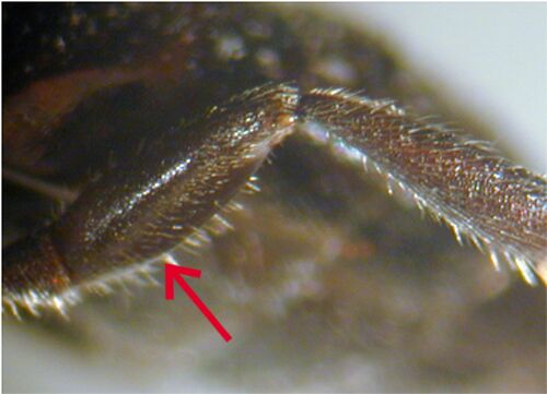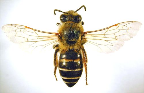 | Female with well-formed scopa enclosing corbicula on underside of hind femur | ![]() |