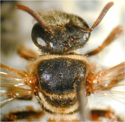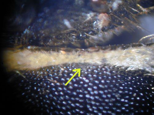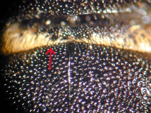 中胸楯板の前縁部中央は下に鋭く曲がって、鋭角となり隆起縁を形成する